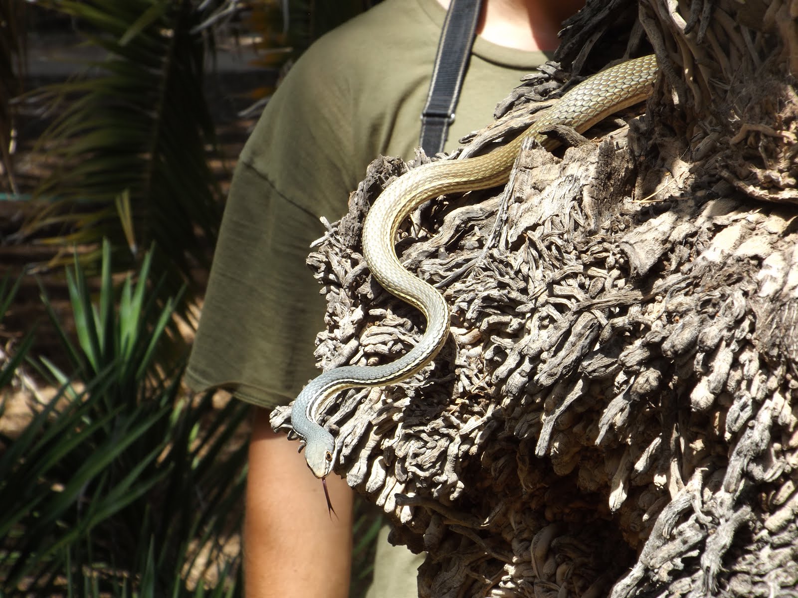 After studying this new snake, Caleb let it go into the brush at the base of the palm. The snake took off like a rocket!